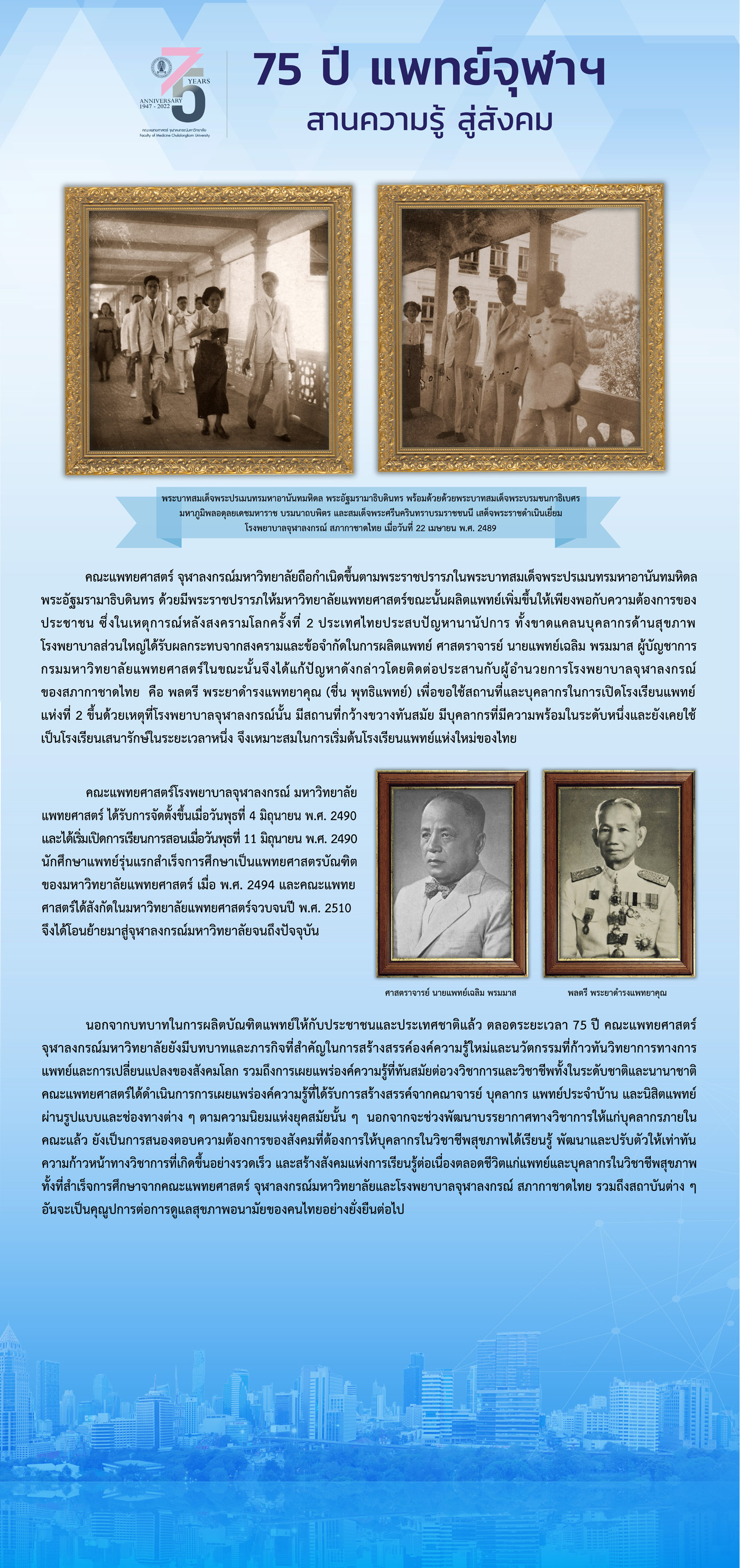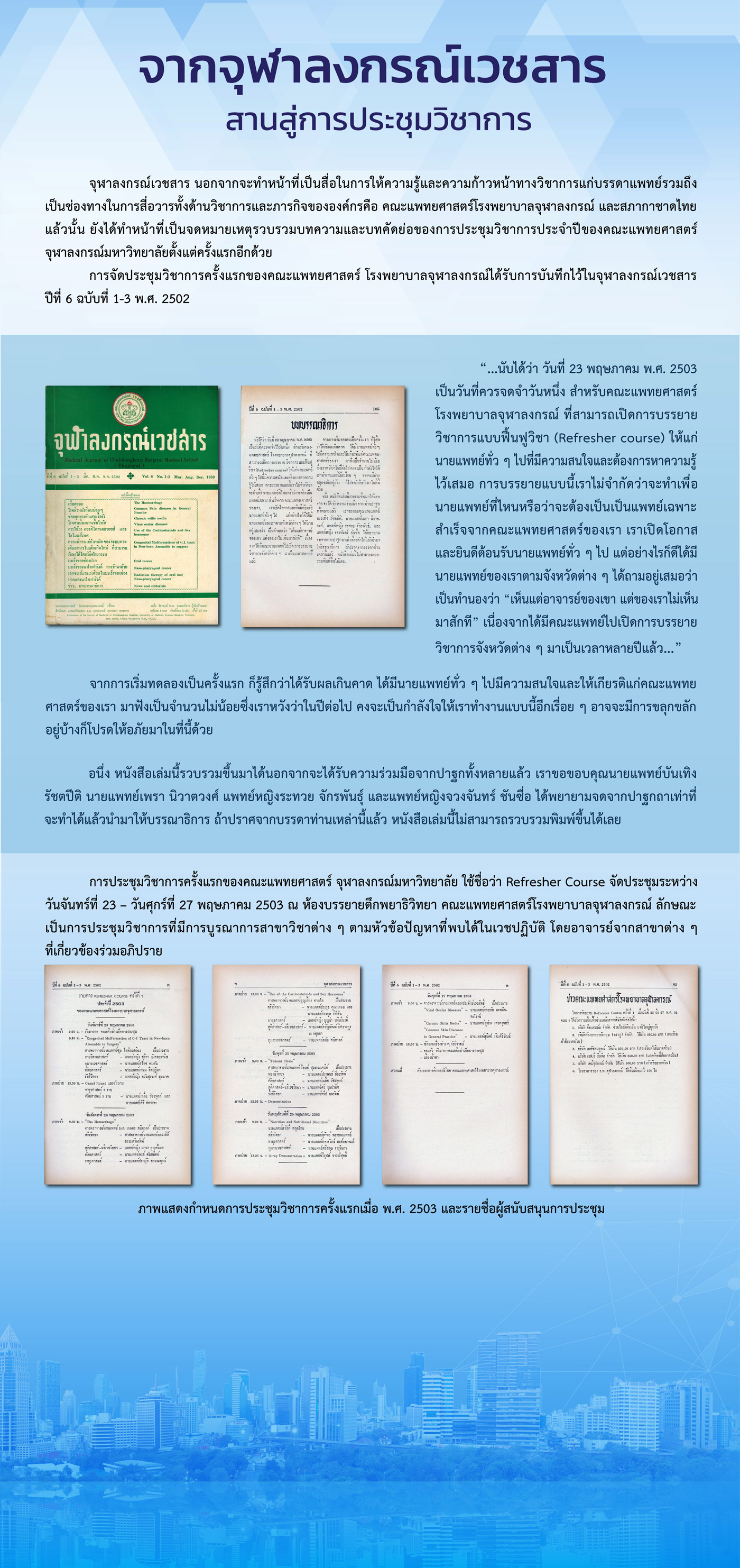 การจัดประชุมวิชาการครั้งแรกของคณะแพทยศาสตร์ จุฬาลงกรณ์มหาวิทยาลัย เกิดขึ้นในเดือนมีนาคม พ.ศ. 2501 โดยมีวัตถุประสงค์ เพื่อเผยแพร่ผลงานวิชาการด้านการแพทย์ การวิจัย และการสาธารณสุข รวมทั้งเพื่อแลกเปลี่ยนความรู้ทางวิชาการ ให้กับแพทย์ บุคลากรทางการแพทย์ทั้งภายในและภายนอก และความรู้ทางการแพทย์แก่ประชาชนทั่วไปอีกด้วย ด้วยรูปแบบของการจัดประชุมวิชาการต่าง ๆ เช่น การจัดประชุมวิชาการประจำปี การจัดประชุมวิชาการประจำเดือน การเสวนา การอบรมระยะสั้น เป็นต้น