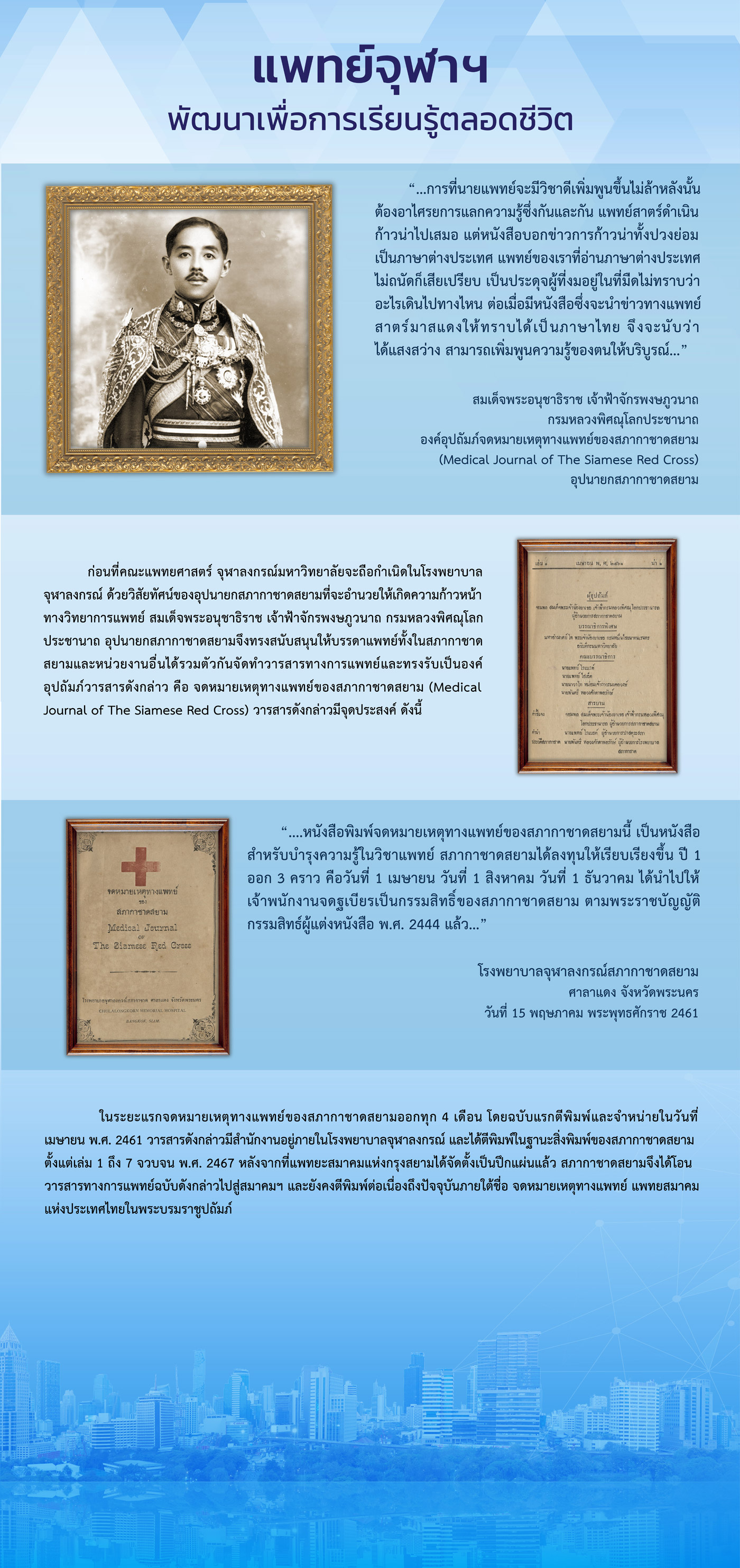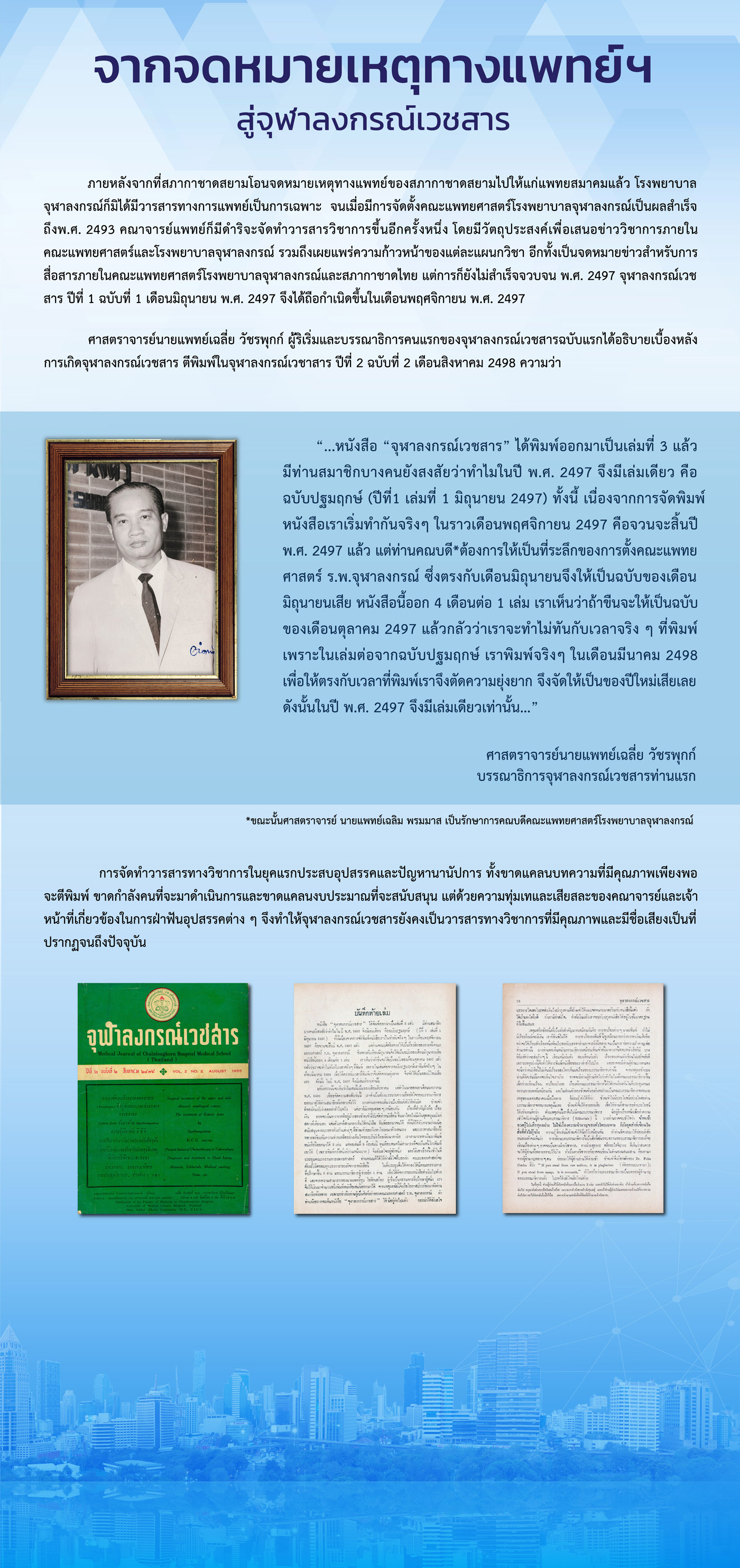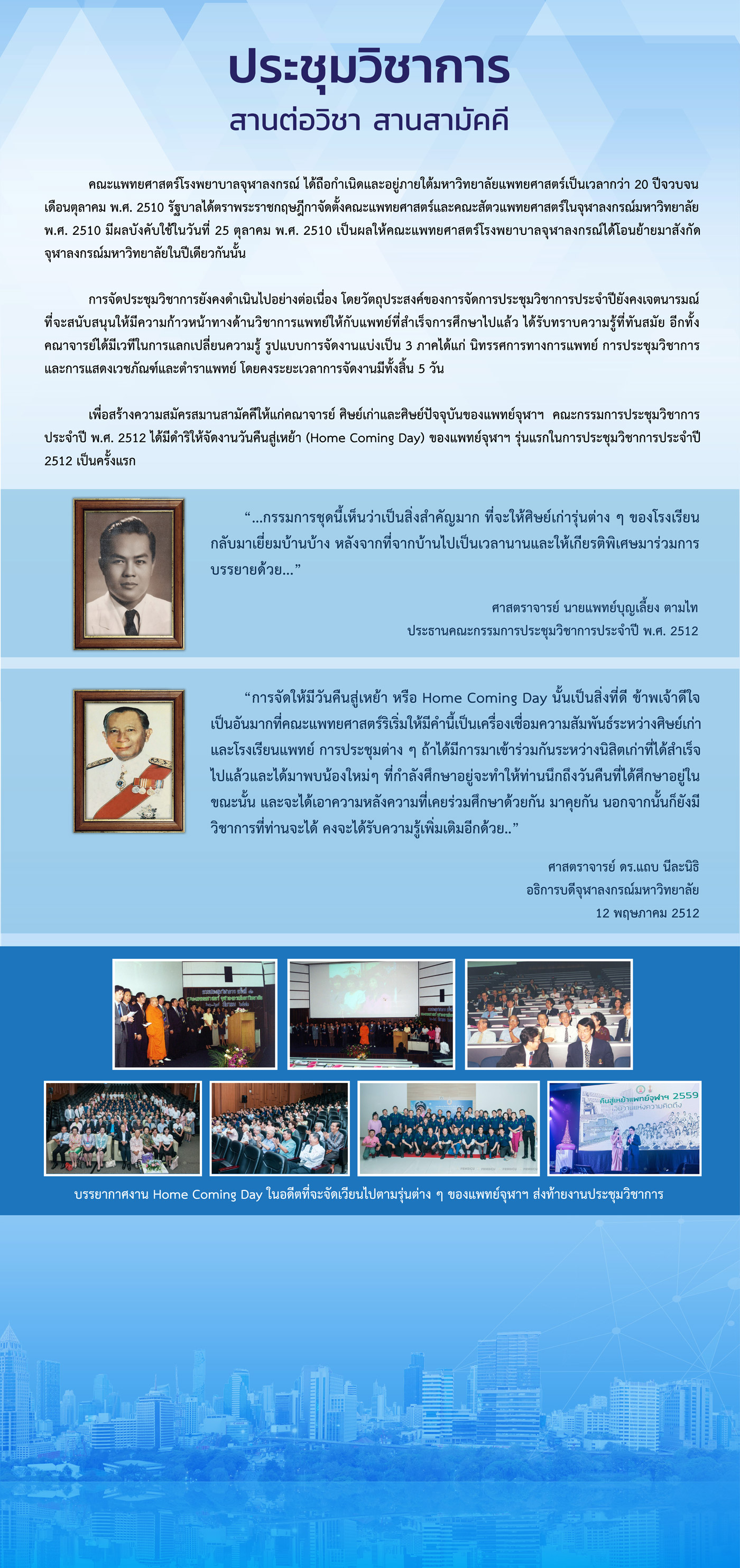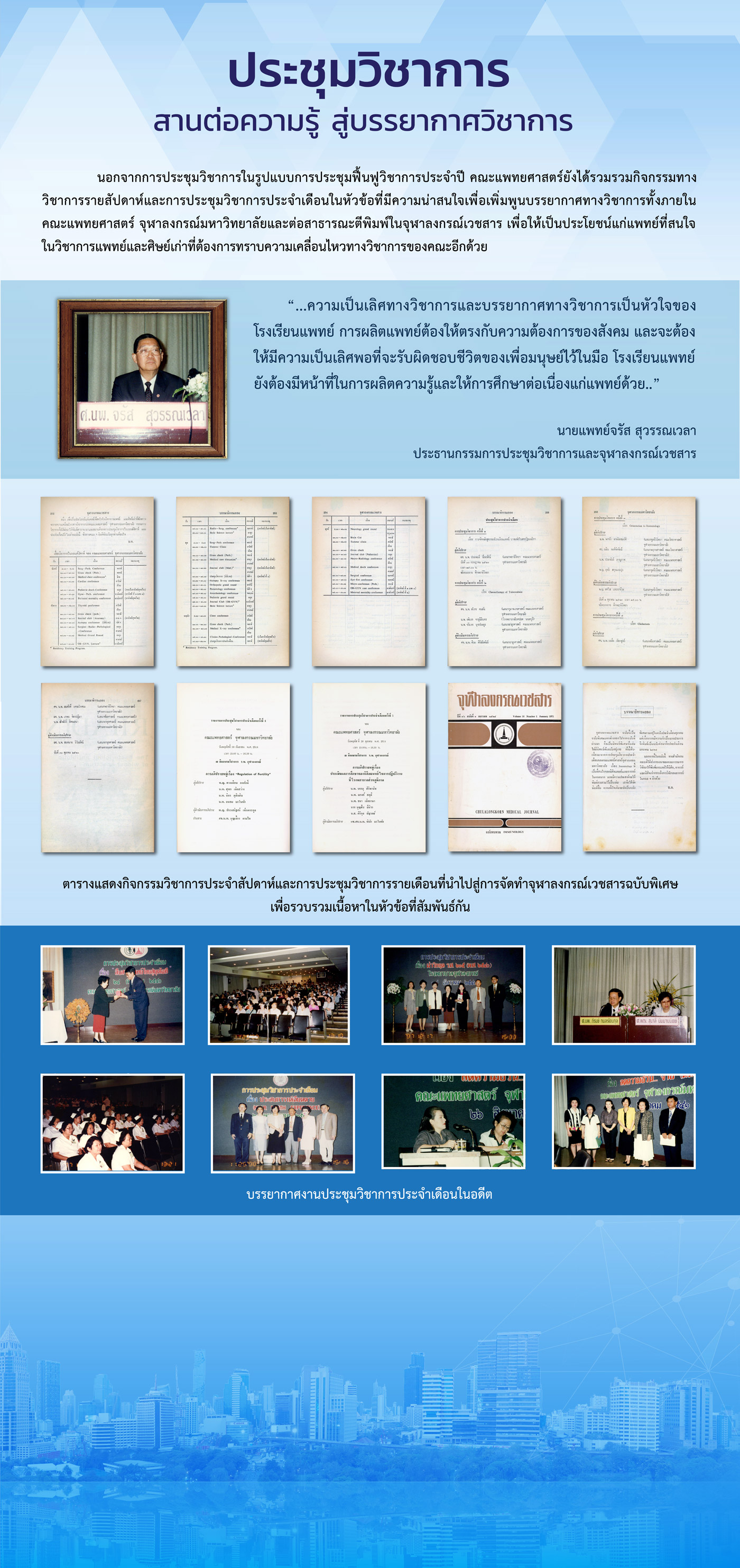ในอดีต คณะแพทยศาสตร์ จุฬาลงกรณ์มหาวิทยาลัย ได้กำหนดนโยบายเรื่องการจัดประชุมวิชาการ โดยมอบหมายให้ทุกภาควิชาต่างๆ รับเป็นเจ้าภาพจัดงานประชุมวิชาการในแต่ละปี เรียงลำดับตามตัวอักษรของภาควิชา (เริ่มด้วยอักษร ก เรียงไปจนครบจนถึงตัวอักษรตัวสุดท้าย) ซึ่งหัวหน้าภาควิชาที่เป็นเจ้าภาพหลักในปีนั้นๆ จะถือว่าเป็นประธานคณะกรรมการประชุมวิชาการโดยตำแหน่ง รองประธานจะเป็นหัวหน้าภาควิชา ที่จะต้องดำเนินการจัดประชุมในปีถัดไป และคณะกรรมการจะประกอบด้วยผู้แทนจากภาควิชา หัวหน้างานที่เกี่ยวข้อง ของคณะแพทยศาสตร์ และโรงพยาบาลจุฬาลงกรณ์ สกากาชาดไทย